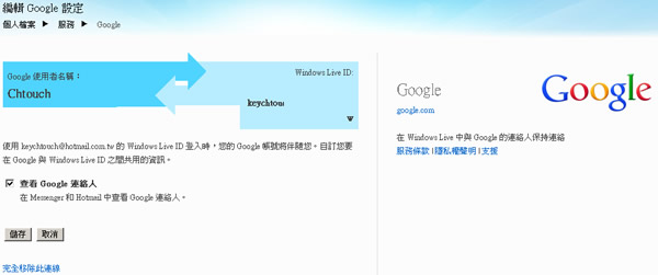 首頁操作技巧Windows 如何在 HotMail 或 Messenger 中與 Google 的連絡人保持連絡? 微軟的 HotMail、Messenger 同屬 Windows Live 內的產品,其特徵在於有聯絡人的功能,不過在這兩個類似產品外的選擇也有很多,想是 Google、Facebook 等,但這些事不同公司內的產品,想要將產品內的聯絡人放在一起方便應用,似乎很難,若有這個困擾,現在就可以將 Google 內的聯絡人通通放到 Windows Live 內,讓你在 HotMail 與 Messenger 中輕鬆應用 Google 內的聯絡人。其實,不光是 Google 帳號可以使用,Facebook、LinkedIn、Twitter、YouTube ...均可。 🔔 不錯過任何精彩! 立即訂閱我們的 LINE 官方帳號 每次發佈新文章時,您將會第一時間收到本站文章連結通知,輕鬆掌握最新資訊! 使用 LINE 追蹤文章更新 §相關文章,還可以參閱:你的 Windows 筆電是真睡還是裝睡?一個設定終結背包發熱耗電學起來!微軟親授 10 個提升 Windows PC 效能的技巧如何升級 Windows 11 25H2?最新版本功能亮點與完整更新步驟Windows 工作列時鐘顯示秒數:真的會影響電池續航力嗎?LTT Labs 完整實測解析Windows 快速取出資料夾檔案名稱清單!內建功能輕鬆搞定,不用額外軟體 如何使用 Google 帳號登入 Windows Live? 1.使用 Windows Live 帳號登入後,便會到達連線 Google 的登入頁面,點擊[連線 Google]。 2.接下來登入你在 Google 所使用的帳號。 3.點擊[Allow access]來同意存取授權允許。 4.點擊[編輯 Google 設定]。 5.點擊[儲存]來將 Google 聯絡人也可以被應用在 HotMail、Messenger。 接下來當登入微軟的 HotMail、Messenger 便可以看到在 Google 內的聯絡人。
