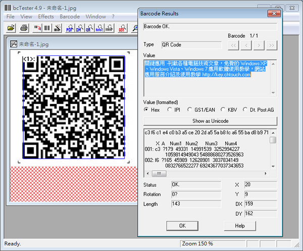 首頁電腦軟體生產力工具 bcTester 在 Windows 上讀取 QR Code 關於 QR 條碼的生成與讀取,多數的免費工具不管是在網路或 Windows 的應用程式大都只有提供生成 QR Code 的功能,那麼如何在 Windows 作業系統也能讀取 QR 碼,若有這個需求可以來安裝 bcTester 這套可在 Windows 上讀取 QR Code 的免費應用工具,使用上相當簡單,只需將 QR Code 的圖形載入 bcTester,選擇正確的條碼按鈕,便可讀取,經測試中文也能正確的識別,bcTester 除了能讀取 QR 條碼之外,還可以讀取二維條碼、PDF417 及 Data Matrix。 🔔 不錯過任何精彩! 立即訂閱我們的 LINE 官方帳號 每次發佈新文章時,您將會第一時間收到本站文章連結通知,輕鬆掌握最新資訊! 使用 LINE 追蹤文章更新 §相關文章,還可以參閱:AingDesk:一鍵安裝 Ollama AI 模型管理器,讓 LLaMA、DeepSeek 在本機電腦上運行Arc 瀏覽器正式登陸 Windows 11,開啟全新瀏覽體驗!Norton Secure Browser 使用 Chromium 核心的瀏覽器,有廣告封鎖和隱私保護功能BingGPT 桌面應用程式,讓你不用 Edge 也能用 Bing 聊天機器人SlippyClerk 數字、英文字母有序字串產生器 可自訂前後綴字詞 如何使用bcTester? 1.完成安裝,開啟 bcTester 後,點擊[Open]來載入含有 QR 條碼或其他條碼的圖形。 2.以本站所介紹的 Free QR Creator 製作 QR 碼免費工具 所生成的 QR Code 為例。 3.載入後,按下上圖紅色框住的按鈕,便可讀取 QR Code 的內容。 你也可以載入其他類型的條碼例如二維條碼、PDF417 及 Data Matrix 等,讀取時,只需選擇正確的條碼讀取按鈕即可。 bcTester版本:4.9.0.104語言:英文性質:免費適用:Windows官方網站:http://www.bctester.de/en/index.htm下載:按我下載