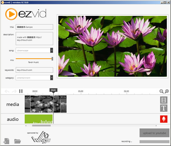 首頁電腦軟體影音視聽 ezvid 螢幕錄影或將相片做成「幻燈片」的影片,並可加入旁白後上傳到 Youtube 現在的數位相機除了可拍照外通常都還有錄影的功能,如何將所拍攝的照片及影片串連成一部影片並加上自己的旁白說明,替美好時光留下可回憶的紀錄呢?若有這個需求時,可以來安裝這套 ezvid 免費工具,ezvid 可將相片及影片串連成一部影片,並可加上自己的旁白或加入文字說明,操作簡單,製作完成後,可上傳自己在 Youtube 的帳號,分享給你的好朋友們觀看。 🔔 不錯過任何精彩! 立即訂閱我們的 LINE 官方帳號 每次發佈新文章時,您將會第一時間收到本站文章連結通知,輕鬆掌握最新資訊! 使用 LINE 追蹤文章更新 §相關文章,還可以參閱:超實用免費軟體!DCP-o-matic 讓你的影片變成電影院 DCP 播放格式語音轉文字免費工具 AsrTools 輕鬆搞定字幕、筆記或歌詞整理免費的 PotPlayer 開始搭載 Whisper AI,讓你即時生成字幕與翻譯,外語影片輕鬆看SpleeterGUI:簡單易用的 AI 音軌分離免費開源工具如何使用 Microsoft Clipchamp 自動產生影片字幕? 如何使用ezvid? 1.安裝完成,開啟 ezvid 後,會自動開啟一個新的專案,可輸入點擊 title(影片名稱)、description(影片描述)、keyword(影片所使用的關鍵字) 等相關欄位,在 Song 處選擇所要的背景音樂(因為要上傳 Youtube,ezvid 不允許使用自己的襯底音樂)後,點擊下方 Media 右側的加入影片或照片按鈕。 2.加入後,可使用滑鼠來調整美照照片所要播方的時間,點擊 Audio 右側的麥克風圖示,便可錄製旁白。 3.點擊[T]還可加入文字說明。 製作完成後,可按下[upload to youtube]來上傳到 youtube。 ezvid版本:0.8.1.0語言:英文性質:免費適用:Windows官方網站:http://www.ezvid.com/下載:按我下載