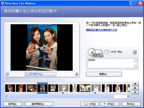 微軟開發的免費Photo Story 3 for Windows是一套可以將多張相片轉成一部影片的程式,在製作的過程中,除了可以針對每張圖片進行簡單的編輯修改外,還可以加入背景音樂、加入標題及語音旁白,且Photo Story 有繁體中文的操作介面,使用上是以精靈的模式來引導操作,讓使用者幾乎沒有障礙的輕輕鬆鬆就能將靜態的相片轉換成有故事的影片。