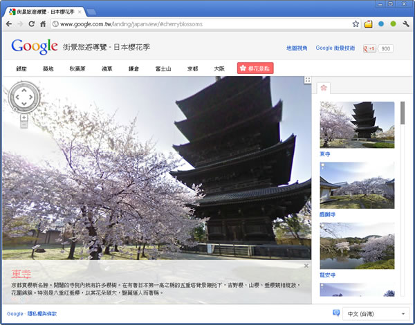 首頁線上工具生活資訊 日本櫻花季 - Google 街景旅遊導覽 今年好像大家對國內的櫻花特別熱愛,加上電視媒體的轟炸式報導,連不去賞櫻花的人今年大概都去了,造成國內幾個可看到櫻花的景點都被擠爆了,對比以往記得都是到日本賞櫻花的,不過,若想省下到日本賞櫻花的旅遊經費,現在就可以利用「Google 街景旅遊導覽」所特別製作的「日本櫻花季」,讓你在電腦前面就可以身歷其境地到日本賞櫻花,若想一併看看像是銀座、築地、秋葉原、富士山、京都、大阪...等日本幾個著名的觀光街景也可以。 🔔 不錯過任何精彩! 立即訂閱我們的 LINE 官方帳號 每次發佈新文章時,您將會第一時間收到本站文章連結通知,輕鬆掌握最新資訊! 使用 LINE 追蹤文章更新 §相關文章,還可以參閱:2026年特色春聯索取指南:總統府、法鼓山、靈鷲山等重點發放據點整理辦護照預約排到 4 月?免排隊秘訣:線上有條件申換,10 個工作日搞定Apple 新一代 AirTag 登場:尋找範圍增 50%,五大升級、售價完整解析2026春節新鈔兌換懶人包|兌換時間地點查詢,手機收發數位紅包教學科技公司拍電影能贏好萊塢嗎?Apple 狂掃六項奧斯卡提名給你答案 Google 街景旅遊導覽 - 日本櫻花季 Windows 7 介紹 1.進入 Google 街景旅遊導覽 - 日本櫻花季網站,可點選[櫻花景點]進入並在右側點選想要觀看的景點。 2.利用滑鼠來移動圖面,適時的放大與縮小想要細看的部分,也可以點擊圖面所出現的黃色箭頭到處看看。 3.欣賞完櫻花,也可以到日本幾個著名的觀光街景來看看。 日本櫻花季 - Google 街景旅遊導覽網站網址:http://www.google.com.tw/landing/japanview/