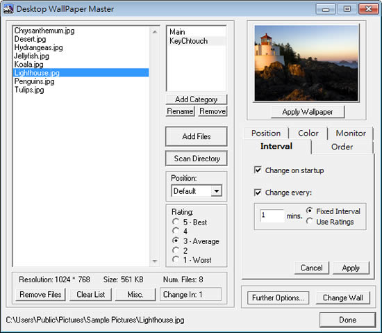 首頁電腦軟體視窗桌面 Wallpaper Master 自動更換桌布為指定照片集內的圖檔(免安裝) 現在的數位相片,均可使用電腦來讀取,若想要將這些相片用來布置成自己電腦上的桌布,可能需要自己一張張的來手動設定,相當麻煩,若有這個需求時,可以來使用 Wallpaper Master 這套免費又免安裝的自動更換桌布工具,他可以讓你將相片進行分類後來讀取,並指定更換桌部的頻率或時間,如此一來,當要更新桌布時,也不需要手動來設定,相當方便,讓自己在電腦前時時刻刻都有好心情。 🔔 不錯過任何精彩! 立即訂閱我們的 LINE 官方帳號 每次發佈新文章時,您將會第一時間收到本站文章連結通知,輕鬆掌握最新資訊! 使用 LINE 追蹤文章更新 §相關文章,還可以參閱:Windows 官方桌布商店來了!超過 400 款風格包,從遊戲到國家公園通通有微軟 City Art Search 自動將 10400多幅世界名畫設置成 Windows 鎖定螢幕畫面Digital Clock 4 可靈活自訂的桌面時鐘,支援報時、計時器、鬧鐘等多款附加套件TrafficMonitor 在 Windows 桌面上顯示網路上傳與下載的即時網速「免費下載」故宮博物院 2023 兔年月曆桌布 如何使用Wallpaper Master? 1.下載免安裝版本,解壓縮後,執行「Wallpaper.exe」便可開啟 Wallpaper Master 程式設定介面。點擊[Add Category]來輸入照片集的分類名稱,再來點擊[Add Files]來加入該分類內的相片。 2.在可 Interval 頁籤,勾選[Change every]來選擇要更換桌布的間隔方式,並設定相關參數。 Position 頁籤內,可設定相片在桌布的呈現位置;Order 頁籤內,可設定相片成為桌布的排序方式及可勾選播放所有分類內的相片。 Wallpaper Master版本:2.16語言:英文性質:免費適用:Windows官方網站:http://jamesgart.com/wallpaperchanger/index.html下載:免安裝版 按我下載 | 安裝版 按我下載