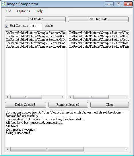 首頁電腦軟體檔案管理 Image Comparator 找出重複的照片並刪除 對於圖檔較大,有時為了避免破壞原始圖檔,通常會複製一份來降低解析度,以利上傳至網路服務,若日後疏於整理儲存在電腦內的圖檔,常會造成重複儲存,想要將重複的照片找出來,可以試試 Image Comparator 這套免安裝又簡單實用的找出重複的照片並刪除免費工具。 🔔 不錯過任何精彩! 立即訂閱我們的 LINE 官方帳號 每次發佈新文章時,您將會第一時間收到本站文章連結通知,輕鬆掌握最新資訊! 使用 LINE 追蹤文章更新 §相關文章,還可以參閱:檔案好多重複怎麼辦?免費 dupeGuru 幫你一鍵清出電腦空間[ 免費使用 ]PDFgear 整合各種 PDF 工具,具格式轉換、編輯、合併或拆分等功能7-Zip 檔案壓縮與解壓縮免費軟體AmoK Exif Sorter 讓照片按拍照日期重新命名並自動分類的免費軟體PDF Unshare 限制 PDF 檔案的讀取有效日期 如何使用Image Comparator? 1.解壓縮後,執行「Image Comparator.exe 」便可開啟,無須安裝。開啟後,按下[Add Folder]來加入要搜尋重複圖片的資料夾,加入完成後,按下[Find Duplicates]便會開始比對。 左右兩欄會列出重複的圖檔檔名,可自由選擇要刪除的圖檔,選擇後,按下[Delete Selected]便會刪除。 2.在[Options]處,可勾選[Include Subfolders - 包含子資料夾]、[Skip Files With Different Size - 略過不同大小的圖檔]及[Auto -Delete Corrupt Files - 自動刪除重複圖檔] Image Comparator版本:1.7.3語言:英文性質:免費適用:Windows官方網站:https://sourceforge.net/projects/imagecomparator/?_test=b下載:按我下載