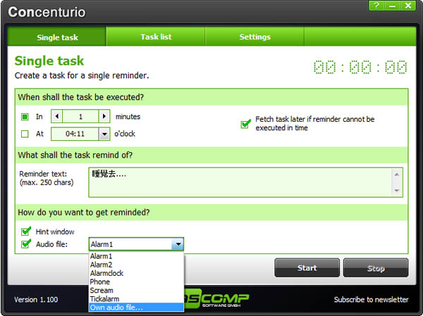 首頁電腦軟體生產力工具 Concenturio 電腦鬧鐘,可自訂多提醒事件與聲音 常在電腦前一工作就會忘東忘西時,可以透過 Concenturio 這套免費的電腦鬧鐘程式來做提醒協助,Concenturio 提供時間倒數與日期時間定點的兩種方式來建立提醒事件,並可自訂提醒時,所使用的 MP3 聲音檔案。 🔔 不錯過任何精彩! 立即訂閱我們的 LINE 官方帳號 每次發佈新文章時,您將會第一時間收到本站文章連結通知,輕鬆掌握最新資訊! 使用 LINE 追蹤文章更新 §相關文章,還可以參閱:AingDesk:一鍵安裝 Ollama AI 模型管理器,讓 LLaMA、DeepSeek 在本機電腦上運行Arc 瀏覽器正式登陸 Windows 11,開啟全新瀏覽體驗!Norton Secure Browser 使用 Chromium 核心的瀏覽器,有廣告封鎖和隱私保護功能BingGPT 桌面應用程式,讓你不用 Edge 也能用 Bing 聊天機器人SlippyClerk 數字、英文字母有序字串產生器 可自訂前後綴字詞 如何使用Concenturio? 1.完成安裝開啟 Concenturio 後,預設會在 Single task 頁籤,可用來建立單一提醒事件,若需要使用自訂的 MP3 聲音檔案,可在介面的最下方 Audio file 處點擊 Own audio file...來選擇。 2.若需要建立多重提醒事件,可切換到 Task List 頁籤後,按下[Add]按鈕來建立。 3.到達預計的設定時間,便會彈出提醒視窗並播放提示音樂。 Concenturio版本:1.100語言:英文性質:免費適用:Windows官方網站:https://www.ascomp.de/products/show/product/concenturio/tab/details下載:按我下載