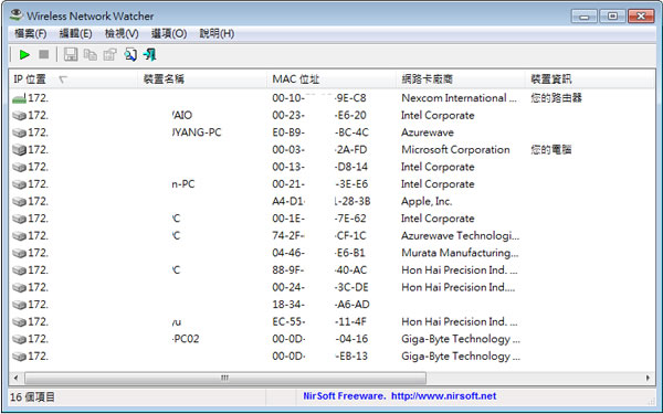 首頁電腦軟體網路應用 Wireless Network Watcher 找出有哪些裝置正在連你的無線網路 現在多數人會使用無線網路分享器來拓展家用或小型辦公室的網路應用,不但可以使多台電腦同時上網,也免除了以往要拉網路線的麻煩,不過正因為方便,因此,對於要管理自己所架設的無線網路基地台時,就是會想知道到底有多少台電腦、手機、平板,正在透過自己的無線網路分享器上網呢?雖然你可以透過分享器內的管理程式得知,不過這樣實在有點麻煩。Wireless Network Watcher 是套免安裝又免費的軟體,可用來快速檢視無線網路分享器有哪些電腦或行動裝置正在使用,除了顯示電腦或手機的 IP 位址與電腦、裝置名稱之外,還可一併顯示該裝置的 MAC Address、網路卡廠牌與其他相關資訊。除了將這些資訊展示在視窗中之外,還可匯出成 html、xml、csv、text… 等格式的文件檔。 🔔 不錯過任何精彩! 立即訂閱我們的 LINE 官方帳號 每次發佈新文章時,您將會第一時間收到本站文章連結通知,輕鬆掌握最新資訊! 使用 LINE 追蹤文章更新 §相關文章,還可以參閱:Bright VPN 提供覆蓋全球60多個位置的免費 VPN服務WhoisThisDomain 網域名稱註冊資料免費查詢工具PingInfoView 可自訂時間 PING 自訂的 IP 或網域並發出通知IPNetInfo IP 資訊查詢工具FileZilla Client 免費 FTP 傳檔軟體(繁體中文 免安裝版) 如何使用 Wireless Network Watcher ? 1.下載解壓縮,執行「WNetWatcher.exe」便可開啟,無須安裝,若需搭配語言檔案,可解壓縮後,置於軟體相同資料夾內即可。 2.開啟後,就會使用目前電腦連線的無線網路基地台進行連線掃描。 Wireless Network Watcher版本:2.30語言:繁體中文(多語言)性質:免費適用:Windows官方網站:https://www.nirsoft.net/utils/wireless_network_watcher.html下載:按我下載 | 繁體中文語言檔
