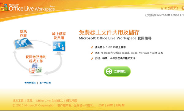 1. 進入Microsoft Office Live Workspace 網站後,若尚未申請Microsft Office Live帳號,可以點擊[登入],若已有請點擊[立即開始]。(Microsft Office Live帳號就是Windows Live ID,若無Windows Live ID請點擊[登入],註冊一個新的帳號)。