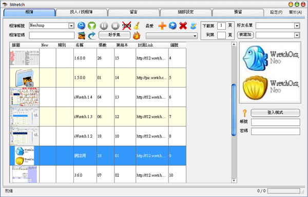 首頁電腦軟體上傳下載 iWretch 無名小站相簿下載、搜尋、留言板備份程式(免安裝版) 無名小站的相簿功能,儘管受到 FaceBook、Google+ 等社交網路所附加的相簿功能擠壓,不過仍然有廣大的愛用者,對於網路相簿的下載與備份,可以來使用 iWretch 這套無名小站相簿下載、搜尋、留言板備份程式,免安裝,開啟後,只需輸入使用者的相簿帳號,若無密碼限制,即可下載。iWretch 的「好手氣」功能可讓你隨機瀏覽與下載相簿,另外還有相簿的搜尋、留言板備份與相片牆產生器等實用功能。 🔔 不錯過任何精彩! 立即訂閱我們的 LINE 官方帳號 每次發佈新文章時,您將會第一時間收到本站文章連結通知,輕鬆掌握最新資訊! 使用 LINE 追蹤文章更新 §相關文章,還可以參閱:ArrowDL 全平台下載利器:輕鬆批量下載 YouTube、BT、FB與多站串流影片YouTubePlaylistDownloader 支援播放清單與頻道的 YouTube 影片下載工具,還能轉換格式Parabolic 讓 yt-dlp 更好用的免費影音下載工具,支援上千個網站的影音下載Hasleo Windows ISO Downloader 幫你從微軟網站下載原版 Windows ISO 檔XMusicDownloader 從音樂網站搜尋並下載歌曲的免費應用程式 如何使用iWretch? 1.下載並解壓縮後,執行「」便可開啟,無須安裝,預設會在[相片]頁籤,帳號是程式作者的帳號,可按下帳號旁邊的放大鏡圖示按鈕,便可找出該帳號的所有相簿,點擊放大鏡右側的倒三角形圖示按鈕,便可下載。 2. 可如下圖所示產生相片牆。 3.按下[好手氣]按鈕,可以隨機取出相簿,在其旁的火焰圖示按鈕,可找出熱門/精選的相簿。 4.找人/找相簿均可輸入關鍵字來搜尋,相當實用,若想下載搜尋出的結果項目,可再欲下載的項目,連續使用滑鼠左鍵雙擊,便可將該自動貼到帳號相簿頁籤。 5.細部設定,可設定相簿下載後的存放路徑;下載檔案的命名規則等等。 iWretch版本:1.7.3.0語言:繁體中文性質:免費適用:Windows官方網站:http://www.wretch.cc/blog/NeoJump/下載:按我下載