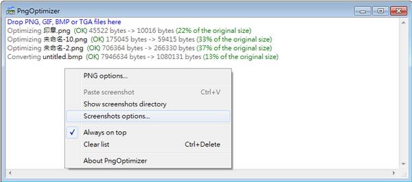 首頁電腦軟體檔案管理 PngOptimizer 圖檔轉 PNG 格式並最佳化(免安裝) 2017-12-29 更新:版本更新至 v2.5.1 Portable Network Graphics(PNG 可 攜式的網路圖形)是一種無損壓縮的點陣圖格式,被廣泛應用於網際網路上,通常我們會視 PNG 為原始圖檔,然後再轉換成其他如 JPG、JPEG、BMP、GIF 等類型圖檔,以求得較小的網頁應用圖形檔,不過若能使用 PngOptimizer 這套可將 PNG 圖形格式最佳化的免費軟體,或許你可以考慮在網頁中直接使用 PNG 圖檔,PngOptimizer 除了可最佳化 PNG 圖形格式 並縮小檔案大小及將 BMP、GIF 或 TGA 轉成 PNG 外,另外還可以將複製好的螢幕擷圖直接貼到 PngOptimizer 來最佳化。 🔔 不錯過任何精彩! 立即訂閱我們的 LINE 官方帳號 每次發佈新文章時,您將會第一時間收到本站文章連結通知,輕鬆掌握最新資訊! 使用 LINE 追蹤文章更新 §相關文章,還可以參閱:檔案好多重複怎麼辦?免費 dupeGuru 幫你一鍵清出電腦空間[ 免費使用 ]PDFgear 整合各種 PDF 工具,具格式轉換、編輯、合併或拆分等功能7-Zip 檔案壓縮與解壓縮免費軟體AmoK Exif Sorter 讓照片按拍照日期重新命名並自動分類的免費軟體PDF Unshare 限制 PDF 檔案的讀取有效日期 如何使用 PngOptimizer ? 1.下載並解壓縮後,執行「PngOptimizer.exe」便可開啟,無須安裝,開啟後,僅需將要最佳化的圖檔使用滑鼠拖拉進 PngOptimizer 介面即可進行。 若在剪貼簿中有圖形檔案,上圖中的 Paste screenshot 便可作用。 2.可點擊[Screenshots options...]來設定轉檔後的存放路徑。 PngOptimizer版本:2.7語言:英文性質:免費適用:Windows官方網站:http://psydk.org/PngOptimizer下載: 按我前往官網下載 32bit 按我下載(158 KB) 64bit 按我下載