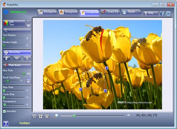 4.完成前景的去背工作,可切換到 Compositic 頁籤,來調整前景在背景中的位置、透明度或加入文字說明。