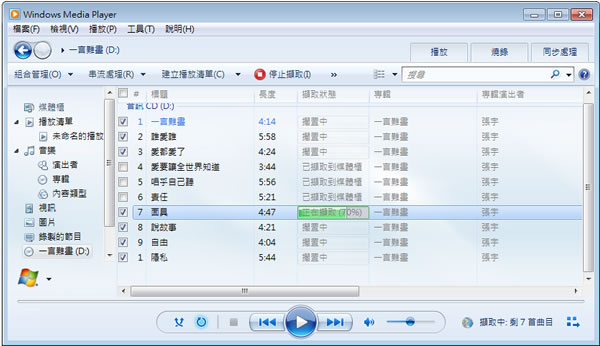 首頁操作技巧Windows 如何將 CD 轉成 MP3? MP3 是一種檔案小音質也不差且攜帶方便的聲音檔案格式,若想將 CD 中的聲音轉成 MP3 時,雖說也有很多的軟體可供應用,但最簡單的方法莫過於利用 Windows 系統內建的 Windows Media Player 影音播放器來轉換,方便又快速。 🔔 不錯過任何精彩! 立即訂閱我們的 LINE 官方帳號 每次發佈新文章時,您將會第一時間收到本站文章連結通知,輕鬆掌握最新資訊! 使用 LINE 追蹤文章更新 §相關文章,還可以參閱:你的 Windows 筆電是真睡還是裝睡?一個設定終結背包發熱耗電學起來!微軟親授 10 個提升 Windows PC 效能的技巧如何升級 Windows 11 25H2?最新版本功能亮點與完整更新步驟Windows 工作列時鐘顯示秒數:真的會影響電池續航力嗎?LTT Labs 完整實測解析Windows 快速取出資料夾檔案名稱清單!內建功能輕鬆搞定,不用額外軟體 如何利用 Windows Media Player 將 CD 轉 MP3? 以下利用 Windows Media Player v12 版本說明: 1.將 CD 放入光碟機後,開啟 Windows Media Player 並讀入。 2.利用功能表[工具] > [選項]來開啟設定介面,可設定擷取轉 MP3 檔案儲存路徑;設定擷取格式及擷取的音訊品質。 3.設定好,回到原介面之後,按下如下圖所示位置的箭頭按鈕 > [擷取 CD]。 4.接下來便可開始轉檔。