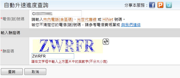 首頁線上工具生活資訊 中華電信 Hinet光世代用戶上傳頻寬免費升速查詢 如果你是中華電信 Hinet光世代用戶,現在將可獲得上傳速度免費升速的服務,在 NCC通過了對「光世代」免費升速的方案之後,中華電信將在 7月起分 3個月內免費幫光世代的 4M、12M、20M、50M、100M 用戶進行上傳頻寬的升速,這對以後要上傳檔案、影片將可更快速,若想知道所申請的 FTTB 何時可排到升速,現在就可透過中華電信網路客服中心來查詢。 🔔 不錯過任何精彩! 立即訂閱我們的 LINE 官方帳號 每次發佈新文章時,您將會第一時間收到本站文章連結通知,輕鬆掌握最新資訊! 使用 LINE 追蹤文章更新 §相關文章,還可以參閱:臺北捷運QR乘車碼上路!支付業者、信用卡感應、轉乘優惠完整攻略Disney+ 跨年追劇清單!2025年末7部台韓美陸劇+1部必看演唱會電影2026台北跨年全攻略:演唱會時間地點、完整卡司名單、101煙火轉播懶人包Gemini 新年賀卡來了!日本郵便推出『#Gemini で年賀状』服務,9種模板3種尺寸任選悠遊卡搭3次雙北捷運送20%悠遊付現金回饋券,登錄規則、限制看這篇 調整前後的速率對照表如下: 原來速率 4M/768K 12M/3M 20M/4M 50M/5M 100M/10M 升速後速率 4M/1M 12M/4M 20M/5M 50M/10M 100M/20M 如何利用中華電信網路客服中心查詢 Hinet光世代上傳頻寬升速日期? 1.使用瀏覽器進入 中華電信網路客服中心 後,點擊[光世代上行頻寬大升級]。 2.點擊[自動升速進度查詢]。 3.輸入所申請的電話號碼(要含區域號碼)及驗證碼後,點擊[查詢]。 4.查詢結果會告訴你預計的升速時間。 中華電信網路客服中心網站網址:https://123.cht.com.tw/