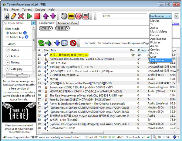 首頁電腦軟體上傳下載 TorrentRover - BT 種子搜尋、下載器 要利用 BT 來下載網路的各種資源,首先就是要有 BT 種子,要如何才能找到想要下載的 BT 種子,除了到專門提供 BT 種子的網站來尋找之外,你也可以來試試 TorrentRover 這套免費的 BT 種子搜尋、下載管理器,只要輸入要下載檔案的關鍵字,就能幫你找出相關的 BT 種子。 🔔 不錯過任何精彩! 立即訂閱我們的 LINE 官方帳號 每次發佈新文章時,您將會第一時間收到本站文章連結通知,輕鬆掌握最新資訊! 使用 LINE 追蹤文章更新 §相關文章,還可以參閱:ArrowDL 全平台下載利器:輕鬆批量下載 YouTube、BT、FB與多站串流影片YouTubePlaylistDownloader 支援播放清單與頻道的 YouTube 影片下載工具,還能轉換格式Parabolic 讓 yt-dlp 更好用的免費影音下載工具,支援上千個網站的影音下載Hasleo Windows ISO Downloader 幫你從微軟網站下載原版 Windows ISO 檔XMusicDownloader 從音樂網站搜尋並下載歌曲的免費應用程式 如何使用TorrentRover? 1.開啟 TorrentRover 後,可在搜尋框中輸入關鍵字後,按下[Go]來開始搜尋,若只想區分檔案類型來搜尋,可點擊[Unclassified]後來選擇分類。 2.針對已搜尋出的 BT 種子,可在要下載的項目使用滑鼠右鍵點擊來下載。 3.下載後的預設儲存位置,可點擊[Options] > [Preferences]來開啟設定視窗,並在 Other 頁籤中來修改。 對於已下載的 BT 種子,需要有 BT 下載器來搭配,例如 迅雷、BitComet(比特彗星)、BitComet...等來搭配 TorrentRover版本:0.17.2語言:英文性質:免費適用:Windows官方網站:http://www.torrentrover.com/下載:按我下載