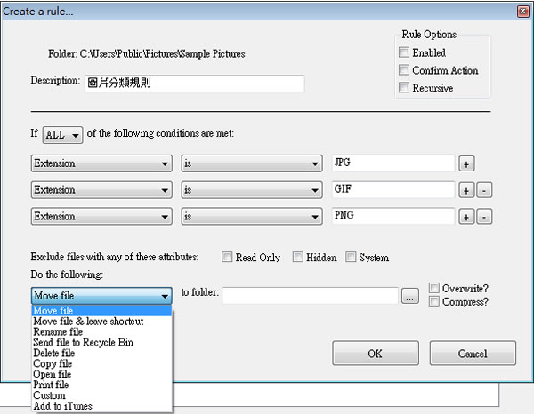 3.接下來定義符合條件的檔案,要做甚麼要的動作,完成定義後,可按下[Test]來進行測試,接下來點擊[OK]便會執行所定規則。