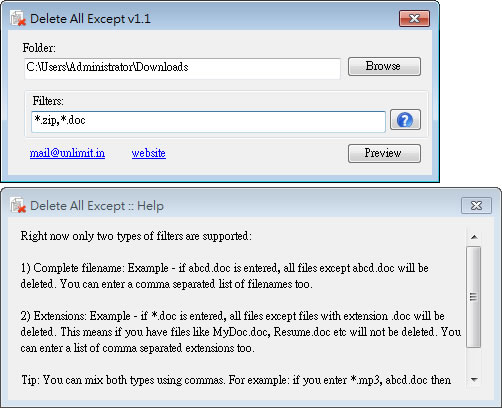 首頁電腦軟體檔案管理 Delete All Except 條件式的刪除檔案工具(免安裝) 想要有效率的整理資料夾內的檔案,若能有工具來輔助應該會是比較快速的方法,Delete All Except 是一套可刪選資料夾內檔案的免費應用軟體,其原理很簡單,只要輸入要保留檔案的副檔名,就可以列出所有要刪除的檔案,方便快速,且免安裝,檔案大小也只有 39 KB,相當適合用來整理資料夾內的檔案工具。 🔔 不錯過任何精彩! 立即訂閱我們的 LINE 官方帳號 每次發佈新文章時,您將會第一時間收到本站文章連結通知,輕鬆掌握最新資訊! 使用 LINE 追蹤文章更新 §相關文章,還可以參閱:檔案好多重複怎麼辦?免費 dupeGuru 幫你一鍵清出電腦空間[ 免費使用 ]PDFgear 整合各種 PDF 工具,具格式轉換、編輯、合併或拆分等功能7-Zip 檔案壓縮與解壓縮免費軟體AmoK Exif Sorter 讓照片按拍照日期重新命名並自動分類的免費軟體PDF Unshare 限制 PDF 檔案的讀取有效日期 如何使用Delete All Except? 1.解壓縮後,執行「DeleteAllExcept.exe」便可開啟,無須安裝。開啟後,介面相當簡單,在 Folder 處,選擇要篩選的資料夾;在 Filters 輸入要保留檔案的副檔名,若有多個,中間可用 , 號加以區隔,若是不清楚規則,可按下 ? 號,來開啟說明。 2.輸入好要保留檔案的副檔名後,可按下[Preview]來預覽保留與即將刪除的檔案明細。 請注意,上方欄為要刪除的檔案,下方欄則會被保留。 Delete All Except版本:1.1語言:英文性質:免費適用:Windows官方網站:http://unlimit.in/delete-all-except.html下載:按我下載