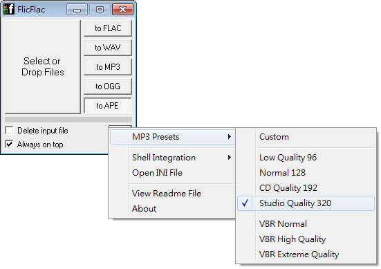 首頁電腦軟體影音視聽 FlicFlac 音樂格式轉檔免費工具(免安裝) 想要讓音樂適合各種設備來播放,可以來使用 FlicFlac 這套介面簡單又實用的音樂格式轉檔免費工具,若是 MP3 的音質不好也可以利用 FlicFlac 來轉換音質較好的 bitrate。 🔔 不錯過任何精彩! 立即訂閱我們的 LINE 官方帳號 每次發佈新文章時,您將會第一時間收到本站文章連結通知,輕鬆掌握最新資訊! 使用 LINE 追蹤文章更新 §相關文章,還可以參閱:超實用免費軟體!DCP-o-matic 讓你的影片變成電影院 DCP 播放格式語音轉文字免費工具 AsrTools 輕鬆搞定字幕、筆記或歌詞整理免費的 PotPlayer 開始搭載 Whisper AI,讓你即時生成字幕與翻譯,外語影片輕鬆看SpleeterGUI:簡單易用的 AI 音軌分離免費開源工具如何使用 Microsoft Clipchamp 自動產生影片字幕? FlicFlac 支援的轉檔格式有: WAV to FLAC · WAV to MP3 · WAV to OGG · WAV to APE FLAC to WAV · FLAC to MP3 · FLAC to OGG · FLAC to APE MP3 to FLAC · MP3 to WAV · MP3 to MP3 (bitrate change) · MP3 to OGG · MP3 to APE OGG to FLAC · OGG to WAV · OGG to MP3 · OGG to APE APE to FLAC · APE to WAV · APE to MP3 · APE to OGG 如何使用 FlicFlac? 1.解壓縮後,執行「FlicFlac.exe」便可開啟無須安裝,開啟後,先選好要轉檔的聲音格式,再將聲音檔案使用滑鼠拖拉到[Select or Drop Files]的位置,一經拖拉過去的檔案,便會開始轉檔。 2.按下介面右下角的工具圖示按鈕,可開啟設定功能表。 FlicFlac版本:1.10語言:英文性質:免費適用:Windows官方網站:https://sector-seven.com/software/flicflac下載:按我下載