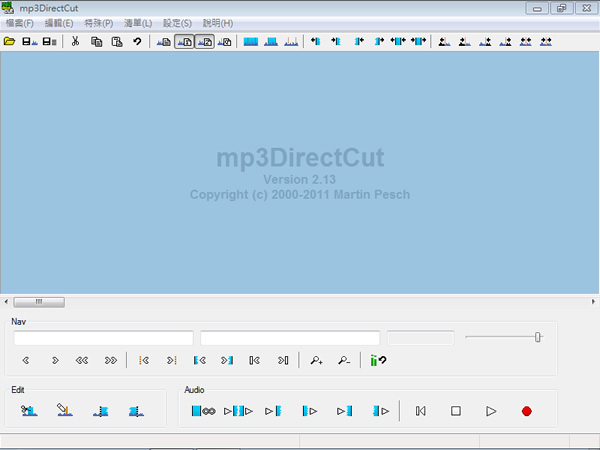 1.下載、安裝 mp3DirectCut 後,開啟主程式後,第一次執行時會先出現組態設定視窗,若想改變介面顯示語言,可在「Language」下拉選單中點選「Chinese Trad」,再點擊[Close]便可將軟體介面切換成繁體中文語系。