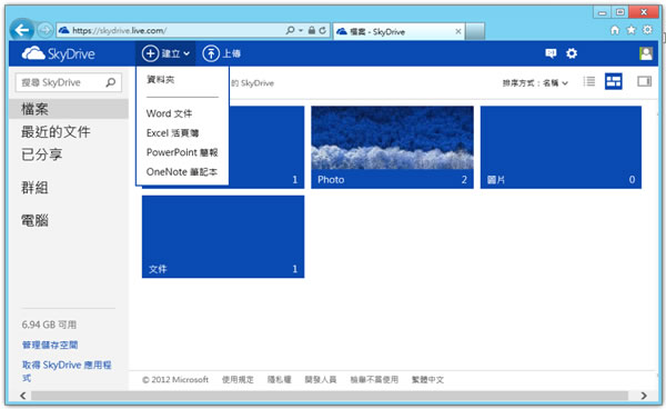 首頁線上工具雲端儲存 使用微軟 SkyDrive 雲端硬碟新介面 微軟的 SkyDrive 雲端硬碟有 7GB 的免費空間 ,在 Apple iCloud(5GB)、Google Drive(5GB) 與 Dropbox(2GB) 相較之下,算是相當不錯的,申請也方便,只需有 Windows Live ID,就可登入 SkyDrive 取得,尤其微軟近日對 SkyDrive 雲端硬碟也做出介面的大改版,使其在操作上與 Windows 8 有相近的風格,在功能上也將文件、郵件、聯絡人、分享...多項功能整合在一起,使用起來也更加方便。 🔔 不錯過任何精彩! 立即訂閱我們的 LINE 官方帳號 每次發佈新文章時,您將會第一時間收到本站文章連結通知,輕鬆掌握最新資訊! 使用 LINE 追蹤文章更新 §相關文章,還可以參閱:「免費圖片空間」Freeimage.host 讓您輕鬆上傳圖片並獲得分享連結LinkPicture 免費圖床上傳產生 URL 外連網址 圖片可直接檢視或內嵌到網頁imghut 免費圖片分享空間 可直接嵌入網頁使用Archive Forever 輸入網址就可以將網頁或網頁截圖永久儲存在區塊鏈上ZoomHub 線上免費圖片分享空間 可內嵌到其它網頁 微軟 SkyDrive 雲端硬碟新介面新介面 1.使用 Windows Live ID 登入。 2.利用 SkyDrive 所提供的功能來建立 Word 文件、Excel 活頁簿、PowerPoint 簡報、OneNote 筆記本等。 3.更方便的整合其他功能。 4.取得可安裝在 Windows 或 Mac OS X 的桌面應用程式。 SkyDrive網站網址:https://skydrive.live.com/