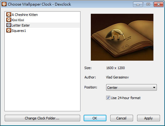 首頁電腦軟體視窗桌面 DexClock 電子時鐘桌布 每天開電腦後,若總是面對同一張桌布或佈景主題,大概心情也不會有特別的變化,還可能會覺得煩,想要更換免費的桌布或佈景主題,可以到 微軟佈景主題館 來下載免費的桌布與佈景主題,若想要在桌布上還可以顯示日期與時間,可以來安裝 DexClock 這套桌布電子時鐘,讓桌面除了有漂亮的桌布亦可顯示日期與時間。 🔔 不錯過任何精彩! 立即訂閱我們的 LINE 官方帳號 每次發佈新文章時,您將會第一時間收到本站文章連結通知,輕鬆掌握最新資訊! 使用 LINE 追蹤文章更新 §相關文章,還可以參閱:微軟 City Art Search 自動將 10400多幅世界名畫設置成 Windows 鎖定螢幕畫面Digital Clock 4 可靈活自訂的桌面時鐘,支援報時、計時器、鬧鐘等多款附加套件TrafficMonitor 在 Windows 桌面上顯示網路上傳與下載的即時網速「免費下載」故宮博物院 2023 兔年月曆桌布TaskSeparator11 可在工作列圖示之間加入分隔線的免費應用程式 如何使用 DexClock? 1.安裝過程預設會改變瀏覽器的預設首頁,請注意! 2.完成安裝開啟 DexClock 後,會在工作列的通知區域顯示 DexClock 的圖示,滑鼠右鍵點擊 > [Choose Wallpaper Clock]。 3.DexClock 預設有四張桌布,選擇要使用的桌布後,點擊[OK]便可。 Dexclock版本:1.3語言:英文性質:免費適用:Windows官方網站:https://www.dexpot.de/dexclock.php?id=dexclock下載:按我前往官網下載