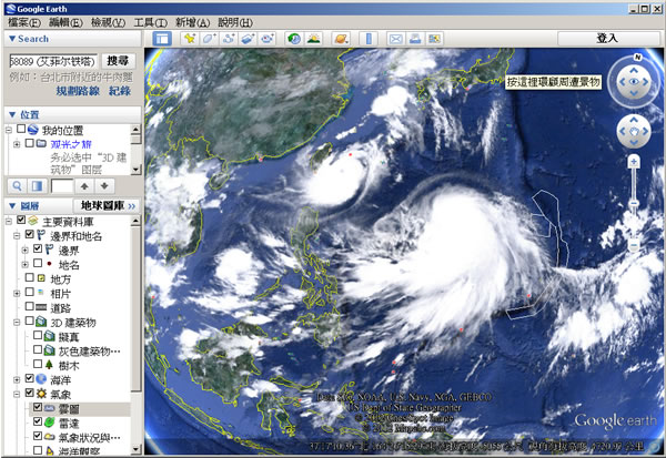 首頁線上工具生活資訊 利用 Google Earth 看氣象雲圖 Google Earth 除了可以讓你掌握全球地理資訊,觀看 3D 建築物、圖像和地形 之外,更可以用來探索星空、月球與火星,不過對於生活的應用上,針對這次兩個颱風接連造訪,也可以利用 Google Earth 來看氣象雲圖,看看颱風在衛星的拍攝下在地球上空的情形。 🔔 不錯過任何精彩! 立即訂閱我們的 LINE 官方帳號 每次發佈新文章時,您將會第一時間收到本站文章連結通知,輕鬆掌握最新資訊! 使用 LINE 追蹤文章更新 §相關文章,還可以參閱:Apple Music 台灣新用戶優惠:6個月免費暢聽,領取方式與限制一次看!2026春節追劇清單!Netflix 2月必看攻略:燒腦推理、火爆動作片,陪你從初一爽追到開工!459 萬人搶 60 萬份!運動幣中獎號碼公布,快查你的身分證尾數都馬一起GO!LINE GO新年優惠最高拿$800優惠券,還有一個月乘車金等你抽過年搭高鐵自由座要排多久?看LINE就知道 台灣高鐵×LINE TODAY推出春節限定燈號預估服務 如何使用 Google Earth 看氣象雲圖? 1.開啟 Google Earth 後,勾選氣象 > 雲圖,即可看到。 2.也可以利用 Google Earth,[檢視] > [探索] > [火星]來看看火星的面貌。 Google Earth網站網址:https://www.google.com/earth/index.html相關網址:按我下載