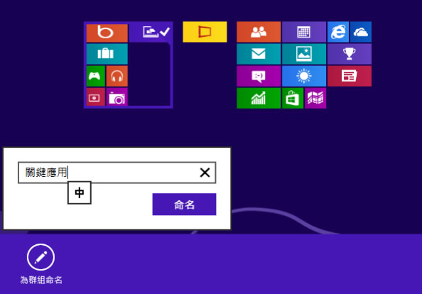 首頁操作技巧Windows 如何在 Windows 8 對磚組進行重新分組與命名? Windows 8 被認為有重大變化,除了操作的改變及功能的增加外,其中一大部分也來自其介面上將功能以塊狀的方式來呈現,稱為「磚」其樣式稱為 Windows 8 Style UI (Metro),每安裝一個應用程式,便會多一塊功能磚,可預知的是當安裝越多的應用程式時,功能磚也越多,屆時想要開啟一個應用程式將會是個麻煩,如何有效的對應用程式磚進行管理?因此分組與命名就變得是不可少的動作。 🔔 不錯過任何精彩! 立即訂閱我們的 LINE 官方帳號 每次發佈新文章時,您將會第一時間收到本站文章連結通知,輕鬆掌握最新資訊! 使用 LINE 追蹤文章更新 §相關文章,還可以參閱:你的 Windows 筆電是真睡還是裝睡?一個設定終結背包發熱耗電學起來!微軟親授 10 個提升 Windows PC 效能的技巧如何升級 Windows 11 25H2?最新版本功能亮點與完整更新步驟Windows 工作列時鐘顯示秒數:真的會影響電池續航力嗎?LTT Labs 完整實測解析Windows 快速取出資料夾檔案名稱清單!內建功能輕鬆搞定,不用額外軟體 Windows 8 對磚組進行重新分組與命名? 1.若要重新分類時,需要在「磚」為大圖示時,使用滑鼠拖動到想要的位置即可。 2.分類好之後,可按下螢幕最右下角的[-]按鈕,將磚組縮小,接著再要命名的磚組,使用滑鼠右鍵點擊,便可看到左下角浮現[為群組命名]的按鈕。 3.點擊[為群組命名]。 4.完成後。