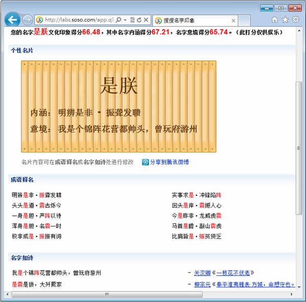 首頁線上工具生活資訊 SOSO名字印象 - 解析你的名字 最近有則關於大陸大學入學新生叫「是朕」及有位同學叫「雍正」及台灣有位叫「王者」的新聞,名字都相當霸氣,讓人也特別有印象。通常我們對重要的事物要取名時,總會特別的小心與警慎,像是剛出生的嬰兒或是新開公司取名,多數人就會付費求助於專業的命理師,希望能取個大吉大利、大富大貴的好名字,對於後續的發展也能有所幫助。至於名字的好壞,見仁見智,每人專業、經歷見解不同,解釋自有不同,不必過於苛求,若是也想解析自己名字,倒是可以到 SOSO名字印象 來試試,除了幫你解析外,另外還幫你的名字用不同字體來書寫成畫與考究名字的起源。 🔔 不錯過任何精彩! 立即訂閱我們的 LINE 官方帳號 每次發佈新文章時,您將會第一時間收到本站文章連結通知,輕鬆掌握最新資訊! 使用 LINE 追蹤文章更新 §相關文章,還可以參閱:Apple Music 台灣新用戶優惠:6個月免費暢聽,領取方式與限制一次看!2026春節追劇清單!Netflix 2月必看攻略:燒腦推理、火爆動作片,陪你從初一爽追到開工!459 萬人搶 60 萬份!運動幣中獎號碼公布,快查你的身分證尾數都馬一起GO!LINE GO新年優惠最高拿$800優惠券,還有一個月乘車金等你抽過年搭高鐵自由座要排多久?看LINE就知道 台灣高鐵×LINE TODAY推出春節限定燈號預估服務 如何使用 SOSO名字印象? 1.使用瀏覽器進入 SOSO名字印象 網站,在名字印象的頁籤中輸入要解析的名字,按下[解析名字]。 2.解析結果。 3.名字如畫與姓名起源。 名字印象網網站網址:http://labs.soso.com/app.q?app=nameshow