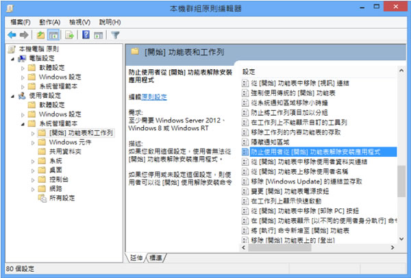 首頁操作技巧Windows Windows 8 如何禁用應用程式的「解除安裝」的功能? Windows 8 增加不少功能,以往熟悉的操作步驟,也做了不少的變更,在程式的解除安裝方面,若想要禁止 Windows 8 用戶隨意的解除安裝在電腦中的某個應用程式,可以利用「本機群組原則編輯器」來設定。 🔔 不錯過任何精彩! 立即訂閱我們的 LINE 官方帳號 每次發佈新文章時,您將會第一時間收到本站文章連結通知,輕鬆掌握最新資訊! 使用 LINE 追蹤文章更新 §相關文章,還可以參閱:你的 Windows 筆電是真睡還是裝睡?一個設定終結背包發熱耗電學起來!微軟親授 10 個提升 Windows PC 效能的技巧如何升級 Windows 11 25H2?最新版本功能亮點與完整更新步驟Windows 工作列時鐘顯示秒數:真的會影響電池續航力嗎?LTT Labs 完整實測解析Windows 快速取出資料夾檔案名稱清單!內建功能輕鬆搞定,不用額外軟體 Windows 8 如何禁用應用程式的「解除安裝」的功能? 1.設定前若在磚組對應用程式使用滑鼠右鍵點擊,可出現[解除安裝]的功能。 2.確定具有系統管理員身分後,在[搜尋]視窗中輸入 gpedit.msc 後,按下[Enter]鍵。 3.在本機群組原則編輯器設定視窗中,如下圖找到[防止使用者從[開始]功能表解除安裝應用程式]並雙擊。 4.設定成[已啟用]後,按下[確定]。 5.套用後。