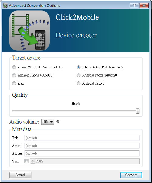 首頁電腦軟體影音視聽 Click2Mobile 將影音轉換成 Android 或 IOS 可播放的格式 目前行動裝置大多數使用的系統為 Android 或 IOS 作業系統,想要將喜愛的影音轉換成這些裝置可播放的格式,可以來使用 Click2Mobile 這套專門轉換 Android 或 IOS 作業系統可播放的影音格式免費軟體。 🔔 不錯過任何精彩! 立即訂閱我們的 LINE 官方帳號 每次發佈新文章時,您將會第一時間收到本站文章連結通知,輕鬆掌握最新資訊! 使用 LINE 追蹤文章更新 §相關文章,還可以參閱:超實用免費軟體!DCP-o-matic 讓你的影片變成電影院 DCP 播放格式語音轉文字免費工具 AsrTools 輕鬆搞定字幕、筆記或歌詞整理免費的 PotPlayer 開始搭載 Whisper AI,讓你即時生成字幕與翻譯,外語影片輕鬆看SpleeterGUI:簡單易用的 AI 音軌分離免費開源工具如何使用 Microsoft Clipchamp 自動產生影片字幕? 如何使用Click2Mobile? 1.完成安裝開啟 Click2Mobile 後,選擇要轉換的影音檔案。 2.挑選要轉換的影音格式。 3.進行轉換。 Click2Mobile版本:1.0語言:英文性質:免費適用:Windows官方網站:http://www.chatnsmile.com/index.php?page=click2mobile#下載:按我下載