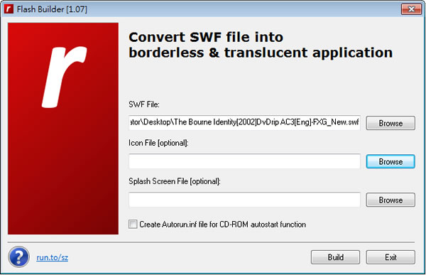 首頁電腦軟體檔案管理 Flash Builder 將 swf 轉exe執行檔 想要將 Flash 的 SWF 格式檔案轉成 EXE 的執行檔格式,方便開啟,可來使用 Flash Builder/Flash Player 這套免費應用軟體,操作簡單且速度快,完成後,僅需開啟該執行檔,便可播放。 🔔 不錯過任何精彩! 立即訂閱我們的 LINE 官方帳號 每次發佈新文章時,您將會第一時間收到本站文章連結通知,輕鬆掌握最新資訊! 使用 LINE 追蹤文章更新 §相關文章,還可以參閱:檔案好多重複怎麼辦?免費 dupeGuru 幫你一鍵清出電腦空間[ 免費使用 ]PDFgear 整合各種 PDF 工具,具格式轉換、編輯、合併或拆分等功能7-Zip 檔案壓縮與解壓縮免費軟體AmoK Exif Sorter 讓照片按拍照日期重新命名並自動分類的免費軟體PDF Unshare 限制 PDF 檔案的讀取有效日期 如何使用Flash Builder/Flash Player? 1.完成安裝開啟 Flash Builder/Flash Player 後,只需依序點擊[Browse](後面兩項為選項,可不填)來選擇檔案,點擊[Build]即可。 2.Flash Builder/Flash Player 提供使用命令列的轉換方式,可參考官網。 fscommand("exec","app.exe"); - executes a file which is located in the fscommand subdirectory fscommand("real_exec","app.exe"); - executes a file which is in the same directory as the executable fscommand("set_title","Window Title"); - sets the window title Flash Builder/Flash Player版本:1.07語言:英文性質:免費適用:Windows官方網站:http://thesz.diecru.eu/content/flash.php下載:按我下載