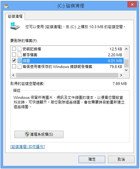 首頁操作技巧Windows Windows 8 如何刪除系統所產生的 Thumbs.db 檔案? 在 Windows 系統中,若有在控制台 > 資料夾選項 > 檢視,所開啟的設定視窗中進行設定[隱藏隱藏的檔案、資料夾及磁碟機]與[隱藏已知檔案類型的副檔名]等選項,可看見多數的磁碟機與資料夾內都有 Thumbs.db 這個檔案,Thumbs.db 這個檔案,可以用來在檔案總管檢視圖示時或工作列上的縮同顯示的更快速,但也造成磁碟空間的浪費,若想要刪除 Thumbs.db 檔案,可以利用檔案搜尋功能,找出所有的 Thumbs.db 來刪除,也可以利用釋放磁碟空間功能來刪除。 🔔 不錯過任何精彩! 立即訂閱我們的 LINE 官方帳號 每次發佈新文章時,您將會第一時間收到本站文章連結通知,輕鬆掌握最新資訊! 使用 LINE 追蹤文章更新 §相關文章,還可以參閱:你的 Windows 筆電是真睡還是裝睡?一個設定終結背包發熱耗電學起來!微軟親授 10 個提升 Windows PC 效能的技巧如何升級 Windows 11 25H2?最新版本功能亮點與完整更新步驟Windows 工作列時鐘顯示秒數:真的會影響電池續航力嗎?LTT Labs 完整實測解析Windows 快速取出資料夾檔案名稱清單!內建功能輕鬆搞定,不用額外軟體 如何刪除 Thumbs.db 檔案? 1.顯示 Thumbs.db 檔案,可在控制台 > 資料夾選項 > 檢視來設定。 2.使用釋放磁碟空間功能。 3.點擊[後釋放磁碟空間]需稍等後。