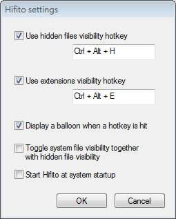 首頁電腦軟體檔案管理 Hifito 快速切換來顯示系統隱藏檔案與檔案副檔名 安裝 Windows 系統後,檔案的附檔名與系統使用的檔案預設都是隱藏的,想要開啟時只需透過[檔案總管] > [組合管理] 來開啟 [資料夾和搜尋選項]視窗便可設定,但這樣切換的步驟其實有點麻煩,這時候可以來使用 Hifito 這套可利用快速鍵來方便切換。 🔔 不錯過任何精彩! 立即訂閱我們的 LINE 官方帳號 每次發佈新文章時,您將會第一時間收到本站文章連結通知,輕鬆掌握最新資訊! 使用 LINE 追蹤文章更新 §相關文章,還可以參閱:檔案好多重複怎麼辦?免費 dupeGuru 幫你一鍵清出電腦空間[ 免費使用 ]PDFgear 整合各種 PDF 工具,具格式轉換、編輯、合併或拆分等功能7-Zip 檔案壓縮與解壓縮免費軟體AmoK Exif Sorter 讓照片按拍照日期重新命名並自動分類的免費軟體PDF Unshare 限制 PDF 檔案的讀取有效日期 如何使用 Hifito 快速切換來顯示系統隱藏檔案與檔案副檔名? 1.完成安裝開啟 Hifito 後,可在系統工作列的通知區域內找到 Hifito 的圖示,使用滑鼠右鍵點擊,便可開啟功能表來快速顯示。 2.點擊[Settings]可開啟切換快速鍵設定視窗。 Hifito版本:1.2語言:英文性質:免費適用:Windows官方網站:http://sourceforge.net/projects/hifito/下載:按我下載