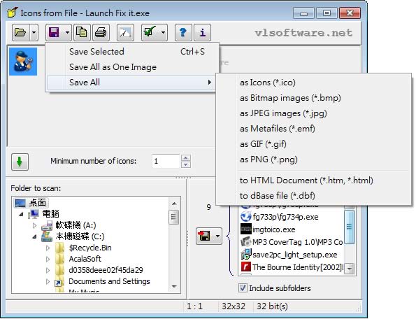 首頁免費素材圖像圖示 Icons from File 取出應用程式中的圖示 應用程式中的圖示都相當精美,若是想取出來修改,可利用 Icons from File 這套免費軟體,取出後,可將圖示轉成 PNG、GIF、JPG、BMP、EMF 等圖片格式或是產生 HTML 語法,讓你更快速的應用。 🔔 不錯過任何精彩! 立即訂閱我們的 LINE 官方帳號 每次發佈新文章時,您將會第一時間收到本站文章連結通知,輕鬆掌握最新資訊! 使用 LINE 追蹤文章更新 §相關文章,還可以參閱:精心打造的等距美學:Isocons 免費圖示資源庫,CC BY 4.0 授權Map-It:日本地圖素材的免費寶庫,從全國到市町村一網打盡PICaboo! 日系可愛免費向量圖素材庫:設計師必收的創作寶庫GAHAG:日本免費圖庫新選擇,結合アハ體驗互動遊戲的創意素材平台illust STAMPO:日式風格的免費插圖素材網站 如何使用Icons from File? 1.完成安裝開啟 Icons from File 後,可點擊資料夾開啟的圖示按鈕來選擇要取出所選應用程式的圖示。 2.若覺得麻煩也可以點擊右下角的[Find files with icons inside>>>]來直接取得磁碟機或資料夾中可取出的圖示。 3.取出圖示後,可點擊[磁碟片圖示按鈕]來選擇要後續的應用。 Icons from File版本:5.1.1語言:英文性質:免費適用:Windows官方網站:https://www.vlsoftware.net/icons-from-file/index.html下載:按我前往官網下載