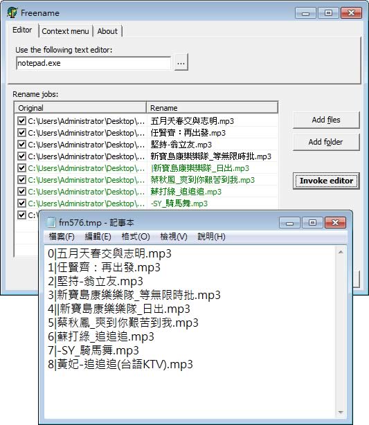 首頁電腦軟體生產力工具 Freename 利用記事本來編輯檔案名稱 若有大量的檔案名稱需要更改,又苦無可套用的規則或是覺得規則過於複雜無從編寫公式,想要尋找一套簡單又直覺可更改檔案名稱的免費軟體,可以來使用 Freename 這套可利用記事本來編輯檔案名稱的免費工具,編輯完成後儲存即可完成檔案名稱的變更,非常適合無規則需手動變更檔名來使用。 🔔 不錯過任何精彩! 立即訂閱我們的 LINE 官方帳號 每次發佈新文章時,您將會第一時間收到本站文章連結通知,輕鬆掌握最新資訊! 使用 LINE 追蹤文章更新 §相關文章,還可以參閱:AingDesk:一鍵安裝 Ollama AI 模型管理器,讓 LLaMA、DeepSeek 在本機電腦上運行Arc 瀏覽器正式登陸 Windows 11,開啟全新瀏覽體驗!Norton Secure Browser 使用 Chromium 核心的瀏覽器,有廣告封鎖和隱私保護功能BingGPT 桌面應用程式,讓你不用 Edge 也能用 Bing 聊天機器人SlippyClerk 數字、英文字母有序字串產生器 可自訂前後綴字詞 如何使用 Freename? 1.解壓縮後,滑鼠雙擊[freename.exe]便可開啟Freename 的應用程式,無須進行安裝。開啟後,點擊[Add files]來加入檔案或點擊[Add folder]整個資料夾內的檔案。 Freename 預設是使用 notepad.exe(內建在 Windows 內的記事本)來編輯,若想更改,可在 Use the following text editor 來變更編輯程式。 2.加入要編更名稱的檔案後,點擊[Invoke editor]便會開啟記事本仔入黨案名稱,供你編輯,完成編輯同樣按下[檔案] > [儲存檔案]後關閉記事本。 3.回到原介面,有更改的過的檔名,會使用不同的顏色標出,確定好之後,按下[Apply renames]正是變更。 Freename版本:0.1語言:英文性質:免費適用:Windows官方網站:http://freename.sourceforge.net/index.php下載:按我下載