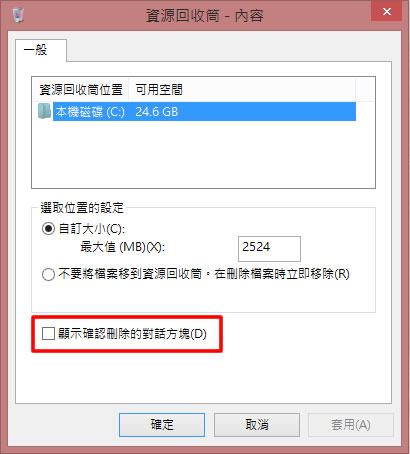 首頁操作技巧Windows Windows 8 如何開啟/關閉刪除檔案確認框? 🔔 不錯過任何精彩! 立即訂閱我們的 LINE 官方帳號 每次發佈新文章時,您將會第一時間收到本站文章連結通知,輕鬆掌握最新資訊! 使用 LINE 追蹤文章更新 §相關文章,還可以參閱:你的 Windows 筆電是真睡還是裝睡?一個設定終結背包發熱耗電學起來!微軟親授 10 個提升 Windows PC 效能的技巧如何升級 Windows 11 25H2?最新版本功能亮點與完整更新步驟Windows 工作列時鐘顯示秒數:真的會影響電池續航力嗎?LTT Labs 完整實測解析Windows 快速取出資料夾檔案名稱清單!內建功能輕鬆搞定,不用額外軟體 如何使用開啟/關閉 Windows 8 刪除檔案確認框? 1.在桌面上使用滑鼠右鍵點擊[資源回收筒] > [內容]。 2.在設定視窗中勾選來開啟確認對話框。