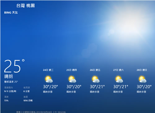 首頁操作技巧Windows Windows 8 如何設定與使用「天氣」 應用程式? 在 Windows 8 預設的功能中有一個「天氣」的應用程式,可精準定位到使用者目前上網位置的當前的溫度與實際體感溫度、風速風向、濕度、能見度、氣壓等天氣狀況,並提供往後一周內的天氣預報,除此之外,還提供氣象圖與溫度、降雨量的歷史紀錄圖讓你參考,另外,亦可設定參考多個地點與國外天氣的變化,是相當實用的功能。 🔔 不錯過任何精彩! 立即訂閱我們的 LINE 官方帳號 每次發佈新文章時,您將會第一時間收到本站文章連結通知,輕鬆掌握最新資訊! 使用 LINE 追蹤文章更新 §相關文章,還可以參閱:你的 Windows 筆電是真睡還是裝睡?一個設定終結背包發熱耗電學起來!微軟親授 10 個提升 Windows PC 效能的技巧如何升級 Windows 11 25H2?最新版本功能亮點與完整更新步驟Windows 工作列時鐘顯示秒數:真的會影響電池續航力嗎?LTT Labs 完整實測解析Windows 快速取出資料夾檔案名稱清單!內建功能輕鬆搞定,不用額外軟體 Windows 8 天氣應用程式的使用與設定 1.可在市集查看有無天氣應用程式的更新。 2.進入天氣應用程式後,可以看到當前的天氣狀態、往後一周的天氣預報與氣象圖及歷史紀錄。 3.可使用滑鼠右鍵點擊介面空白處,來開啟設定功能表。 4.增加查看地點。 5.世界天氣。