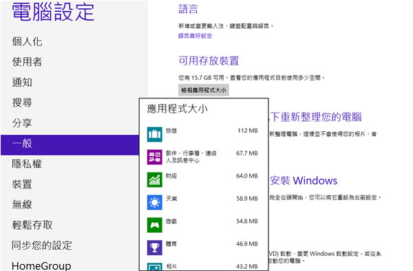 首頁操作技巧Windows 如何檢視 Windows 8 所安裝的應用程式(App)使用多少空間? 在安裝 Windows 8 時,會預設安裝很多的在市集中的 App,有天氣、股市、Bing、旅遊...等等,如何查看這些市集應用程式加上更新後所占用的磁碟空間呢? 🔔 不錯過任何精彩! 立即訂閱我們的 LINE 官方帳號 每次發佈新文章時,您將會第一時間收到本站文章連結通知,輕鬆掌握最新資訊! 使用 LINE 追蹤文章更新 §相關文章,還可以參閱:你的 Windows 筆電是真睡還是裝睡?一個設定終結背包發熱耗電學起來!微軟親授 10 個提升 Windows PC 效能的技巧如何升級 Windows 11 25H2?最新版本功能亮點與完整更新步驟Windows 工作列時鐘顯示秒數:真的會影響電池續航力嗎?LTT Labs 完整實測解析Windows 快速取出資料夾檔案名稱清單!內建功能輕鬆搞定,不用額外軟體 如何檢視 Windows 8 所安裝的應用程式(App)使用多少空間? 1.使用鍵盤的 Windows 鍵+C 來開啟側邊功能表,點擊[設定]。 2.點擊[變更電腦設定]。 3.切換到[一般]頁籤後,在可用存放裝置處,點擊[檢視應用程式大小]便可查看。
