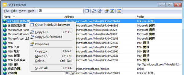首頁電腦軟體生產力工具 Find Favorites 利用關鍵字搜尋「我的最愛」 使用 Microsoft IE 瀏覽器瀏覽網頁時,通常遇到不錯的網頁時就會加入到「我的最愛」,時間久了,便會有一堆網址在內,若是疏於整理,估計要找到剛剛才加入的書籤,大概都很難。Find Favorites 可以來幫助我們利用關鍵字來搜尋「我的最愛」內的所有項目,邊輸入邊篩選,相當方便。 🔔 不錯過任何精彩! 立即訂閱我們的 LINE 官方帳號 每次發佈新文章時,您將會第一時間收到本站文章連結通知,輕鬆掌握最新資訊! 使用 LINE 追蹤文章更新 §相關文章,還可以參閱:AingDesk:一鍵安裝 Ollama AI 模型管理器,讓 LLaMA、DeepSeek 在本機電腦上運行Arc 瀏覽器正式登陸 Windows 11,開啟全新瀏覽體驗!Norton Secure Browser 使用 Chromium 核心的瀏覽器,有廣告封鎖和隱私保護功能BingGPT 桌面應用程式,讓你不用 Edge 也能用 Bing 聊天機器人SlippyClerk 數字、英文字母有序字串產生器 可自訂前後綴字詞 如何使用 Find Favorites? 1.開啟 Find Favorites 後,便會直接列出目前在 IE瀏覽器內「我的最愛」中所有項目,可在上方輸入要搜尋的關鍵字。 2.可使用滑鼠右鍵對項目進行點擊,便可開啟右鍵功能表。 3.也可以透過 File > Export Favorites to HTML File... 匯出成 HTML 檔案。 Find Favorites版本:3.11語言:英文性質:免費適用:Windows 需 IE4以上版本官方網站:http://www.carthagosoft.net/MemInfo.php下載:按我下載
