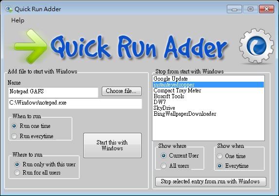 首頁電腦軟體系統應用 Quick Run Adder 加入或停用隨 Windows 開機而自動執行的應用軟體 多數的免費工具,都是關閉隨 Windows 自動啟用的程式,來加快開機的時間,而 Quick Run Adder 除了有上述關閉的功能外,若真有想要讓某些應用程式在 Windows 開機後,便可自動執行時,也可以透過這套免費軟體來加入。 🔔 不錯過任何精彩! 立即訂閱我們的 LINE 官方帳號 每次發佈新文章時,您將會第一時間收到本站文章連結通知,輕鬆掌握最新資訊! 使用 LINE 追蹤文章更新 §相關文章,還可以參閱:CatLock:可鎖定鍵盤的 Windows 應用程式,防止寵物意外觸碰Zen Ad blocker 瀏覽器與應用程式均適用的廣告攔截器,免費且開放原始碼TimVer 一站式顯示 Windows 版本及電腦硬體相關訊息的工具「微軟電腦管家」內含開機啟動項目管理、儲存空間最佳化等免費工具 全方位提升電腦效能Windows Startup Timer 測量 Windows 從開機到完全啟動所需時間 如何使用 Quick Run Adder? 解壓縮後執行「Quick Run Adder.exe」便可開啟,無須安裝。開啟後,會自動列出目前隨 Windows 開機而自動啟用的應用程序。 Quick Run Adder版本:1.0語言:英文性質:免費適用:Windows官方網站:http://www.gromichoafsystems.com/quick-run-adder/#more-213下載:按我下載