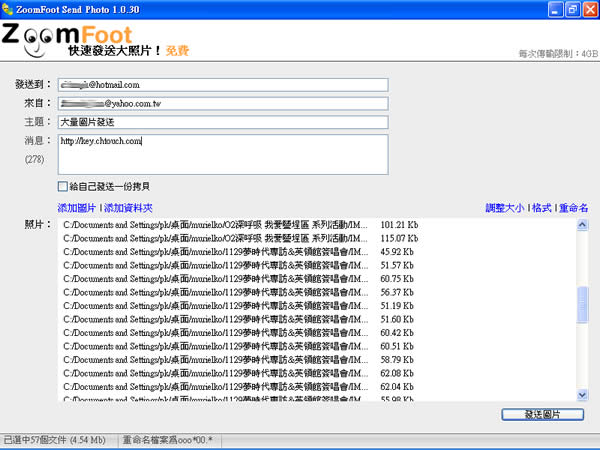 當我們要使用電子郵件寄送圖片時,碰到較大的檔案就會進行壓縮,然後才會進行傳送或是要傳送一堆的相片,可能的做法也是壓縮成一個ZIP檔案然後才會寄出去,現在這個動作可以由 ZoomFoot Send Photo 這套軟體來幫你完成, ZoomFoot Send Photo 是一個免費軟體,所使用的原理就是當發送者發送大量圖片給收信者的時候,並非將整個檔案以電子郵件的方式進行傳送,而是發一封下載連結的通知信,讓收件人可以點擊進入下載,每次傳送不限圖片張數,只要合計不超過4GB就可以傳送,傳送前還可以幫你調整圖檔的大小、進行格式轉換及批次更名,這個服務是免費的。