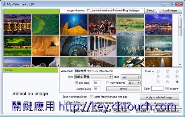 首頁電腦軟體影像繪圖 My Watermark 批次替圖片加上浮水印(免安裝) 有很多時候,我們會想將圖片加上浮水印,尤其是預計上傳分享到網路上,要替圖片加入浮水印不難,有很多的軟體都可以做,但大都支援單張,若是有大量的圖片想要加上浮水印時,可能就不適用,這時候,可以來使用 My Watermark 這套可單張或批次將所選圖片加入文字浮水印的應用工具,簡單又實用。 🔔 不錯過任何精彩! 立即訂閱我們的 LINE 官方帳號 每次發佈新文章時,您將會第一時間收到本站文章連結通知,輕鬆掌握最新資訊! 使用 LINE 追蹤文章更新 §相關文章,還可以參閱:告別訂閱制!Canva 旗下 Affinity 永久免費,向量設計、影像處理、排版工具全面開放Pineapple Pictures 載入速度超快的相片檢視器(免安裝)PhotoResizerOK 可快速調整圖片尺寸的免費軟體ShortDoorNote 將輸入的文字快速轉成圖片Bzzt! Image Editor 圖片批次壓縮、轉檔及尺寸調整的免費工具 如何使用 My Watermark? 1.解壓縮所下載的檔案後,執行「My_Watermark.exe」便可開啟,無須安裝。開啟後,點擊[select]來選擇要加入浮水印的圖片或資料夾。 在 WaterMark 處,輸入要產生水印的文字 Position 可勾選浮水印在圖片中的位置及是否產生陰影 Apply to selected image 只產生所選圖片的浮水印 Apply to all images all folder 資料夾內所有圖片,都印上浮水印 2.產生浮水印的圖片會儲存在來源圖片路徑下一個 watermake 的子資料夾。 My Watermark版本:2.12語言:英文性質:免費適用:Windows官方網站:http://www.myportablesoftware.com/mywatermark.aspx下載:按我下載