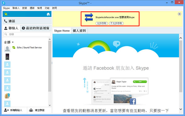 1.解壓縮後,執行「」便可開啟,無須安裝。開啟後,會在工作列的通知區域產生 Skype Auto Recorder 的圖示,此時的圖示為灰色,接下來開啟 Skype 通話軟體,便會出現詢問是否允許 SkypeAutoRecorder.exe 存取對話框,點擊[允許存取]後, Skype Auto Recorder 的圖示會由灰色變為綠色,使用滑鼠右鍵點擊,可叫出功能表。