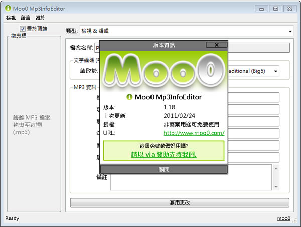 首頁電腦軟體影音視聽 Moo0 Mp3InfoEditor MP3音樂檔摘要編輯器(繁體中文版) 有些時候我們下載到的MP3音樂檔的檔名會是亂碼,此時可以使用Windows內建的「重新命名」功能來進行變更,但若是使用滑鼠在該檔案以右鍵點擊[內容]來顯示摘要時,還是有可能都是亂碼,或是自己製作的MP3音樂檔,想要加入摘要資訊,以便在日後可以查看。Moo0 Mp3InfoEditor 就是一套可以編輯MP3音樂檔摘要的免費程式,提供繁體介面也支援批次加入摘要的功能,操作簡單,有需要的朋友可以試試。 🔔 不錯過任何精彩! 立即訂閱我們的 LINE 官方帳號 每次發佈新文章時,您將會第一時間收到本站文章連結通知,輕鬆掌握最新資訊! 使用 LINE 追蹤文章更新 §相關文章,還可以參閱:超實用免費軟體!DCP-o-matic 讓你的影片變成電影院 DCP 播放格式語音轉文字免費工具 AsrTools 輕鬆搞定字幕、筆記或歌詞整理免費的 PotPlayer 開始搭載 Whisper AI,讓你即時生成字幕與翻譯,外語影片輕鬆看SpleeterGUI:簡單易用的 AI 音軌分離免費開源工具如何使用 Microsoft Clipchamp 自動產生影片字幕? 如何使用Moo0 Mp3InfoEditor 編輯MP3音樂檔內容摘要? 1.下載安裝完成後,開啟 Moo0 Mp3InfoEditor 主程式後,將要編輯摘要的MP3音樂檔,使用滑鼠拖拉放到Moo0 Mp3InfoEditor程式後,便會顯示原有的摘要,若是顯示亂碼,可在文字編碼欄裡的「讀取於:」中的下拉選項選擇合適的語言編碼。 2.輸入要顯示的摘要後,點擊[套用更改],便完成變更。 3.檢視摘要 4.若是該檔案摘要有受保護,可先點擊[解除封鎖]。 5.若要批次變更摘要,點擊[類型]並在下拉選項中選取[批次修改檔案],將要編輯摘要的MP3音樂檔,使用滑鼠批次拖拉放到Moo0 Mp3InfoEditor程式後,在MP3資訊中勾選要批次更改的欄位,例如歌手、專輯及年份等(一經勾選要修改的欄位時就會進行寫入變更)。 Moo0 Mp3InfoEditor版本:1.23語言:繁體中文(多國語言)性質:免費適用:Windows官方網站:http://www.moo0.com/下載:按我下載
