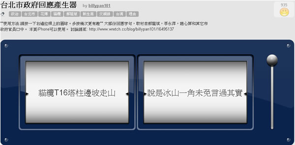 首頁線上工具益智遊戲 「Random Life - 和多繽紛樂」賓果資料產生器 「Random Life - 和多繽紛樂」是一個利用賓果拉霸的方式來產生各式各樣的結果,透過靈活的設計你可以將各式資料放到賓果機內,拉下拉霸之後就會以亂數回答一個結果,像現在很流行的「文青產生器」、「電影名稱製造機」、「馬總統個人專屬理由產生器」、「遲到理由產生器」、「逢甲空資誰會被二一」、「漫畫製造機」、「請假理由產生器」、「彰化師大之今天該吃什麼? 」、「台北市政府回應產生器」......等等,拉下拉捍,答案便能轉到眼前。 🔔 不錯過任何精彩! 立即訂閱我們的 LINE 官方帳號 每次發佈新文章時,您將會第一時間收到本站文章連結通知,輕鬆掌握最新資訊! 使用 LINE 追蹤文章更新 §相關文章,還可以參閱:Google Doodle 萬聖節遊戲登場!小精靈 45 週年特別版完整介紹毫秒級反應力大挑戰!用 Reaxon 訓練大腦、眼睛與手的協調反應2048 Cupcakes 經典單人 2048 滑塊線上遊戲,AI 輔助輕鬆挑戰高分免費線上拼圖遊戲平台:iLoveJigsaw 可自行上傳圖片製作拼圖Songlio:線上聽音樂猜歌曲名稱遊戲,可自訂歌曲題庫並與多人一起挑戰 如何使用 Random Life - 和多繽紛樂? 1.進入網站首頁,會以目前使用率最高產生器來當首頁,利用滑鼠來拉桿,所產生的結果會記錄在賓果機下方。 2.點擊[CREATE]可來建立產生器,點擊[FEATURED & BEST]可來看看現有多少產生器。 3.文青產生器。 Random Life網站網址:http://bingo.handlino.com/