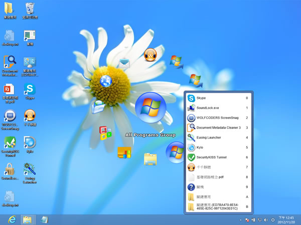 首頁電腦軟體視窗桌面 Eusing Launcher 讓桌面的圖示捷徑能有不同的排列方式 電腦桌面常會因應工作或娛樂的需要建立不同的圖示捷徑,Windows 傳統的排列方式就是直行,除非自己手動拉位置,再根據設定的排序方式進行,如果想要改變方式,或許你可以試試 Eusing Launcher 這套免費的桌面圖示功能按鈕重排工具,讓桌面功能圖示,也能有更好的操作方式與多樣化的呈現。 🔔 不錯過任何精彩! 立即訂閱我們的 LINE 官方帳號 每次發佈新文章時,您將會第一時間收到本站文章連結通知,輕鬆掌握最新資訊! 使用 LINE 追蹤文章更新 §相關文章,還可以參閱:Windows 官方桌布商店來了!超過 400 款風格包,從遊戲到國家公園通通有微軟 City Art Search 自動將 10400多幅世界名畫設置成 Windows 鎖定螢幕畫面Digital Clock 4 可靈活自訂的桌面時鐘,支援報時、計時器、鬧鐘等多款附加套件TrafficMonitor 在 Windows 桌面上顯示網路上傳與下載的即時網速「免費下載」故宮博物院 2023 兔年月曆桌布 如何使用 Eusing Launcher? 1.完成安裝,開啟 Eusing Launcher 應用程式後,便可在桌面看到以圓形方式來陳列的功能捷徑,其中的 Windows 含箭頭標誌為捷徑,可將桌面的捷徑直接拖拉進去替換或自行建立。 2.預設已有幾個功能圖示,包含[開始]按鈕,使用滑鼠點擊,便可開啟功能表。 3.使用滑鼠右鍵點擊圓形中央的大圓形,可開啟 Eusing Launcher 功能表。 其中: Modify User Name & User Icon:可用來設定中央圓形的圖片與修改使用者名稱 Settings:開啟 Eusing Launcher設定視窗 4.開啟 Eusing Launcher 設定視窗,可用來調整應用程式是否隨 Windows 開機而自動啟用與設定好的組態備份與還原等。 5.在 Appearance 頁籤,可設定 Eusing Launcher 外觀。 Eusing Launcher版本:3.5語言:英文性質:免費適用:Windows官方網站:https://www.eusing.com/index.html下載:按我下載