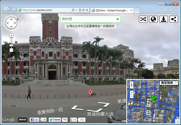 首頁線上工具生活資訊 Instant Google Street View 直接使用 Google 街景檢視地圖 若覺得 Google 地圖內的街景功能還要拖拉小人才能檢視有點麻煩,現在你可以來使用 Instant Google Street View 這個免費服務,讓你輸入邊輸入地址邊用 Google 的街景來檢視,同 Google Map 的操作方式,可切換為地圖/街景檢視,可以儲存目前的地圖為 JPG 圖檔,也可以產生一個超連結來分享這個街景,相當方便。 🔔 不錯過任何精彩! 立即訂閱我們的 LINE 官方帳號 每次發佈新文章時,您將會第一時間收到本站文章連結通知,輕鬆掌握最新資訊! 使用 LINE 追蹤文章更新 §相關文章,還可以參閱:Apple Music 台灣新用戶優惠:6個月免費暢聽,領取方式與限制一次看!2026春節追劇清單!Netflix 2月必看攻略:燒腦推理、火爆動作片,陪你從初一爽追到開工!459 萬人搶 60 萬份!運動幣中獎號碼公布,快查你的身分證尾數都馬一起GO!LINE GO新年優惠最高拿$800優惠券,還有一個月乘車金等你抽過年搭高鐵自由座要排多久?看LINE就知道 台灣高鐵×LINE TODAY推出春節限定燈號預估服務 如何使用 Instant Google Street View? 1.使用瀏覽器進入 http://www.qsview.com/ 網站後,輸入地址的同時,便會開始定位。 2.右上角的四個圖示按鈕,由左至右依序為 隨機產生一個與目前位置相近的位置 街景與地圖切換 目前所顯示的圖片下載 利用超連接分享 最後,你可能會發現輸入框的顏色會改變 。 綠色:有提供街景檢視 橘色:沒有提供街景檢視服務 紅色:找不到位址 Instant Google Street View網站網址:https://www.instantstreetview.com/