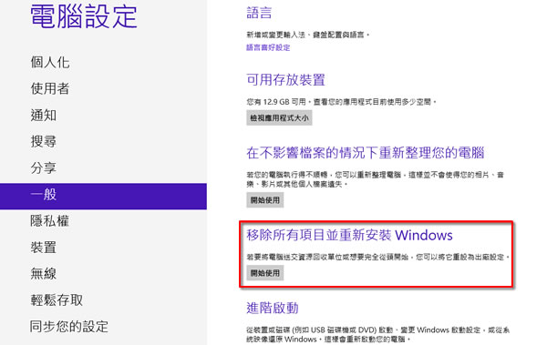 首頁操作技巧Windows 如何讓 Windows 8 回復到剛出廠安裝好的狀態? 電腦備份的動作不可少,在 Windows 中,透過系統備份機制的映像檔可以讓電腦回復到所選的備份檔。讓電腦回復到之前的狀態,但若是想要讓系統更乾淨,以往的做法就是格式化來重新安裝,現在在 Windows 8 你可以不需要這麼麻煩,透過簡單的動作便可以將電腦回復到出廠時的設定。 🔔 不錯過任何精彩! 立即訂閱我們的 LINE 官方帳號 每次發佈新文章時,您將會第一時間收到本站文章連結通知,輕鬆掌握最新資訊! 使用 LINE 追蹤文章更新 §相關文章,還可以參閱:你的 Windows 筆電是真睡還是裝睡?一個設定終結背包發熱耗電學起來!微軟親授 10 個提升 Windows PC 效能的技巧如何升級 Windows 11 25H2?最新版本功能亮點與完整更新步驟Windows 工作列時鐘顯示秒數:真的會影響電池續航力嗎?LTT Labs 完整實測解析Windows 快速取出資料夾檔案名稱清單!內建功能輕鬆搞定,不用額外軟體 如何讓 Windows 8 回復到剛安裝好的狀態? 1.按下鍵盤 Windows Key + C 快速鍵來開啟側邊工具列,點擊[設定] > [變更電腦設定]。 2.在一般頁籤中,在移除所有項目並重新安裝Windows 項目下點擊「開始使用」。