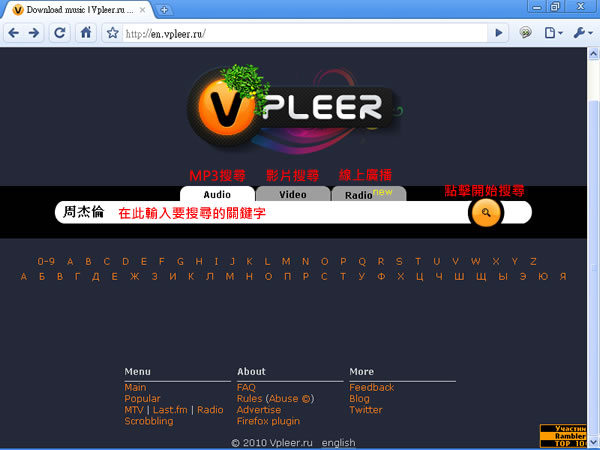 首頁線上工具上傳下載 vpleer.ru 支援中文的影片及MP3搜尋引擎,搜到的通通可下載! vpleer.ru 是一個主要提供影音及MP3音樂搜尋的服務網站,除了支援繁體中文的搜尋,還可將搜尋到的結果,如果是MP3音樂檔可直接下載,若是影音檔,還可以下載 FLV 格式,相當不錯的網站。 🔔 不錯過任何精彩! 立即訂閱我們的 LINE 官方帳號 每次發佈新文章時,您將會第一時間收到本站文章連結通知,輕鬆掌握最新資訊! 使用 LINE 追蹤文章更新 §相關文章,還可以參閱:M3U8 Player:本地瀏覽器處理,播放、下載、轉 MP4 一站免費完成getM3U8 免費線上工具:輕鬆下載 M3U8 串流影片並轉檔 MP4SnapWC 免費影片下載器:一鍵搞定 YT、IG、FB、抖音等 10,000+ 平台影片、音訊、圖片需要分享圖片連結?試試 PiXhost 免費圖床服務P2PFileShare 線上 P2P 傳檔免費工具,免安裝無檔案大小限制直接瀏覽器傳輸 如何使用http://en.vpleer.ru/ 所提供的搜尋服務? 1.點擊上方網址進入該網站,並在「Audio」、「Video」及「Radio」三個頁籤中,選擇一個要搜尋的頁籤(目前「Radio」頁籤好像是不能搜尋),輸入要搜尋的關鍵字後,點擊輸入框後的搜尋按鈕。 2.接著就會將搜尋到的結果列出,並可在線上收聽或直接下載。 3.若要搜尋影片,選擇「Video」後,輸入關鍵字後點擊[搜尋]。 4.結果列出後,點擊要觀看的影片。 5.若要下載,點擊影片下方的Download FLV 若下載後需要轉檔或影片要轉成MP3格式,請參閱Format Factory 格式工廠,萬用多媒體轉檔工具軟體(安裝設定及影片轉檔教學) vpleer.ru網站網址:http://en.vpleer.ru/
