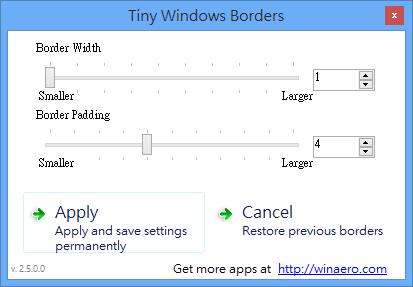 首頁電腦軟體系統應用 Tiny Windows Borders 輕鬆更改 Windows 視窗邊框大小 Windows 作業系統中每個功能都有一個視窗可供操作,其邊框可供我們識別操作範圍,想要更改系統預設的邊框寬度,你可以不需要修改註冊表,只需使用 Tiny Windows Borders 這個壓縮過後只有 48KB 檔案大小且免安裝又免費的工具,就能輕鬆更改 Windows 視窗邊框大小,並提供回復到上個調整值的功能。 🔔 不錯過任何精彩! 立即訂閱我們的 LINE 官方帳號 每次發佈新文章時,您將會第一時間收到本站文章連結通知,輕鬆掌握最新資訊! 使用 LINE 追蹤文章更新 §相關文章,還可以參閱:CatLock:可鎖定鍵盤的 Windows 應用程式,防止寵物意外觸碰Zen Ad blocker 瀏覽器與應用程式均適用的廣告攔截器,免費且開放原始碼TimVer 一站式顯示 Windows 版本及電腦硬體相關訊息的工具「微軟電腦管家」內含開機啟動項目管理、儲存空間最佳化等免費工具 全方位提升電腦效能Windows Startup Timer 測量 Windows 從開機到完全啟動所需時間 如何使用Tiny Windows Borders? 1.開啟 Tiny Windows Borders 應用程式後,透過滑鼠拉動,便能調整邊框大小。 Apply:調整完後,按下[Apply]便完成調整 Cancel:回復到上一個調整值 2.調整前、後。 Tiny Windows Borders版本:2.5語言:英文性質:免費適用:Windows官方網站:https://winaero.com/tiny-windows-borders-for-windows-8/下載:按我下載