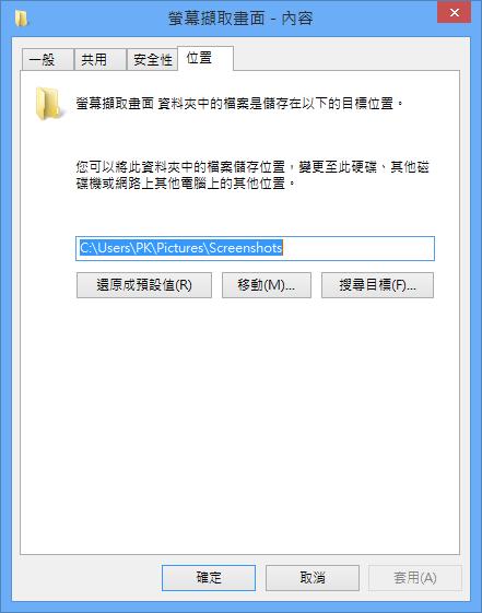 首頁操作技巧Windows 如何更改 Windows 8 中「螢幕擷取畫面」資料夾所預設的位置? 在 Windows 8 以前的版本要擷取螢幕畫面成圖案,你可能會使用鍵盤的 PrintScreen 鍵,然後貼到小畫家之類的圖片編輯軟體,再來儲存。在 Windows 8 ,除了原功能外,還可以利用 Windows 鍵 + Print Screen 擷取全螢幕畫面並自動存成 PNG 格式的圖檔,而儲存的路徑,系統預設會是在 C:\Users\(user-name)\Pictures\Screenshots 這個位置,那麼,如何才能更改路徑?方便後續的應用。 🔔 不錯過任何精彩! 立即訂閱我們的 LINE 官方帳號 每次發佈新文章時,您將會第一時間收到本站文章連結通知,輕鬆掌握最新資訊! 使用 LINE 追蹤文章更新 §相關文章,還可以參閱:你的 Windows 筆電是真睡還是裝睡?一個設定終結背包發熱耗電學起來!微軟親授 10 個提升 Windows PC 效能的技巧如何升級 Windows 11 25H2?最新版本功能亮點與完整更新步驟Windows 工作列時鐘顯示秒數:真的會影響電池續航力嗎?LTT Labs 完整實測解析Windows 快速取出資料夾檔案名稱清單!內建功能輕鬆搞定,不用額外軟體 如何更改 Windows 8 中「螢幕擷取畫面」資料夾所預設的位置? 1.開啟 Windows 檔案總管,巡覽到媒體櫃 > 螢幕擷取畫面這個資料夾,並使用滑鼠右鍵點擊,再點擊[內容]。 2.在所開啟的設定視窗中,切換到位置頁籤,點擊[移動],並在後續所出現的視窗來選擇要儲存的位置。 3.完成後,會出現確認的提示與原位置無法使用的提示訊息框。