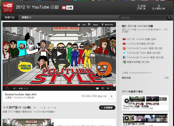 首頁線上工具影音視聽 2012 年 YouTube 回顧 - 十大熱門影片 2012 年接近尾聲,鬧的沸沸揚揚的世界末日應該就快驗證是真是假,不過那是題外話,12 月 21日冬至,又+一歲啦,這也是題外話,來看看標題所寫的 2012 年 YouTube 所整理的十大熱門影片,包含台灣、全球、韓國、日本、香港...等等,台灣呢? 🔔 不錯過任何精彩! 立即訂閱我們的 LINE 官方帳號 每次發佈新文章時,您將會第一時間收到本站文章連結通知,輕鬆掌握最新資訊! 使用 LINE 追蹤文章更新 §相關文章,還可以參閱:來了!OpenAI Sora Android 版上線 Google Play,台灣用戶同步開放Google 親授 Veo 3.1 用電影語言與音效設計打造完美 AI 影片Sora Watermarker:一鍵為影片加上 OpenAI Sora 浮水印一文看懂 Grok Imagine v0.9 升級亮點,再用範例帶你實戰圖像與影片生成魔法免邀請碼免VPN!MindVideo 讓你無限次免費用 Sora 2 生成影片 2012 年 YouTube 回顧 - 十大熱門影片 台灣:2012 年台灣10大熱門影片:按這裡 PSY – GANGNAM STYLE (강남스타일) M/V ::首播::Mayday五月天【我不願讓你一個人】MV官方完整-末日版 =首播=羅志祥 Show [不具名的悲傷] 官方版 MV Kimberley陳芳語首波主打[愛你]官方版MV(HD) PLAY蝦咪GAME? 林宥嘉 – 傻子 (電影「愛LOVE」主題曲) 官方版MV Jane / 黃美珍 “途中" (愛上巧克力 片尾曲) 追到手後。男人的轉變 (整個城市。都是蔡阿嘎的靠杯館City CauPei 2) 蔡依林 Jolin Tsai – 大藝術家The Great Artist [HD]林書豪打爆小牛8分鐘紀錄 Jeremy Lin Knicks VS Mavericks 2012 年全球10大熱門影片:按這裡 2012 年韓國10大熱門影片:按這裡 2012 年日本10大熱門影片: 按這裡 2012 年香港10大熱門影片:按這裡 2012 年 YouTube 回顧網站網址:http://www.youtube.com/user/theyearinreviewTW