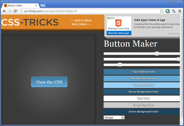 首頁線上工具開發工具 CSS-TRICKS Button Maker 按鈕 CSS 線上產生器 想要改變按鈕的外觀,在以前我們可能都會使用圖片來代替,現在也可以來試試 CSS-TRICKS 網站所提供的「按鈕 CSS 線上產生器」,只需透過幾個步驟,就能讓按鈕產生圓角框、漸層顏色,另外,亦提供自訂按鈕各個部份的顏色,相當方便,幫助你快速的將網頁內的按鈕套用所產生的 CSS 樣式。 🔔 不錯過任何精彩! 立即訂閱我們的 LINE 官方帳號 每次發佈新文章時,您將會第一時間收到本站文章連結通知,輕鬆掌握最新資訊! 使用 LINE 追蹤文章更新 §相關文章,還可以參閱:網站效能健檢免費工具!PageTest 多裝置模擬效能分析及由 AI 提出改進建議Regex-Vis 圖解正則表達式的線上工具,可編寫還可驗證Sitemap Generator:線上快速產生符合 SEO 標準的網站地圖,無網址數量限制適用各類型網站網站隱私權政策產生器 Privacy Policy Generator:輸入網站名稱和網址即可輕鬆生成專屬條款Frame0:輕鬆繪製應用程式流程圖、UML 和介面雛形的免費工具,適用於 macOS 與 Windows 如何使用 CSS-TRICKS Button Maker 按鈕 CSS 線上產生器? 1.使用瀏覽器進入 CSS-TRICKS Button Maker 網站後,左側窗格提供右側窗格中參數改變後的立即可見的按鈕 CSS。 2.透過滑鼠的拖拉與顏色選擇器的參數改變。 3.最終按下左窗格中的 View the CSS 按鈕,便可取出 CSS 語法。 CSS-TRICKS Button Maker網站網址:https://css-tricks.com/examples/ButtonMaker/#